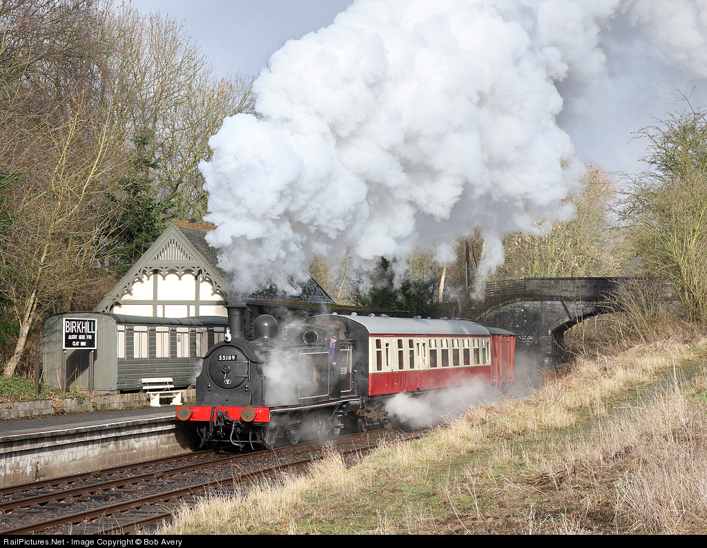 | Caldeonian railway 1907-built 0-4-4T #419 has recently been outshopped as BR #55189 in 1950s style livery. The engine is on a photo charter accurately recreating an early 1950s Scottish branch line train, performing a runby at Birkhill. |