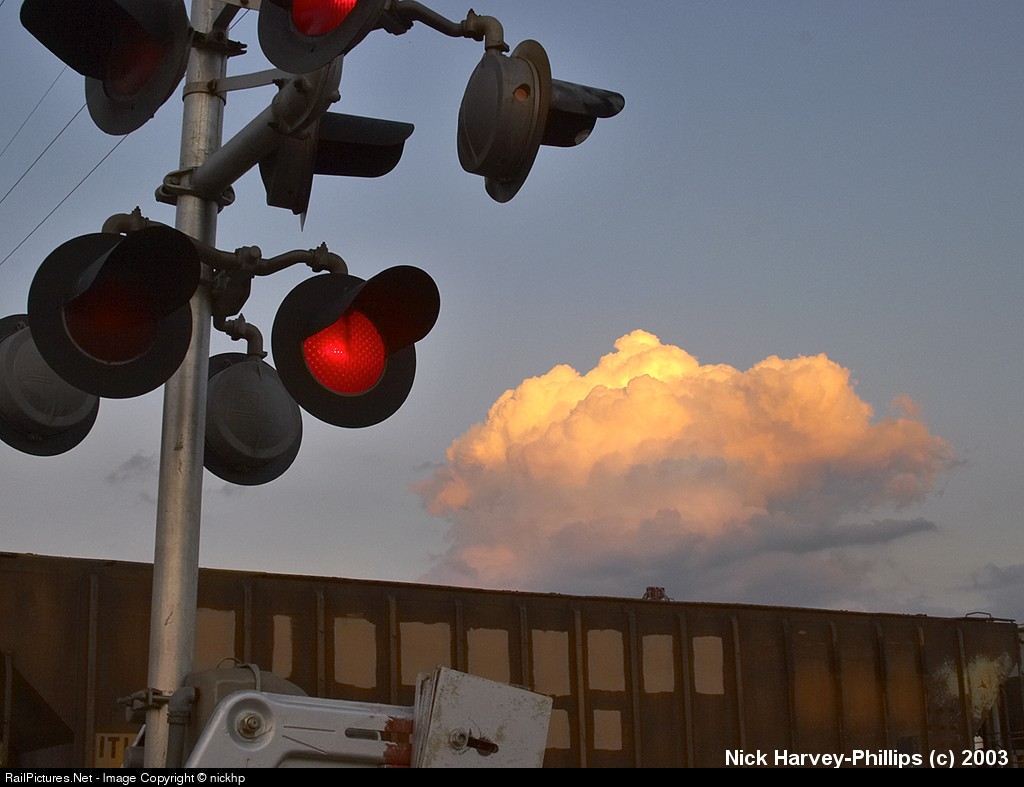 Crossing flashers with a thunderhead for a backdrop.