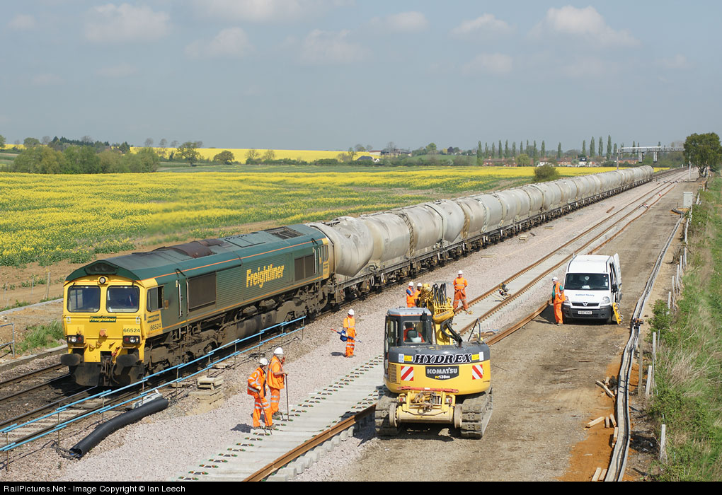 | 66524 on the Earles to Thurrock cement passes the worksite which is in place to put the slow line back in between Wellingborough & Kettering.This will alleviate the bottlenecks that are Harrowden & Kettering South Jcts,allowing freights to run on the slowline all the way from Bedford & Kettering North Jct. |