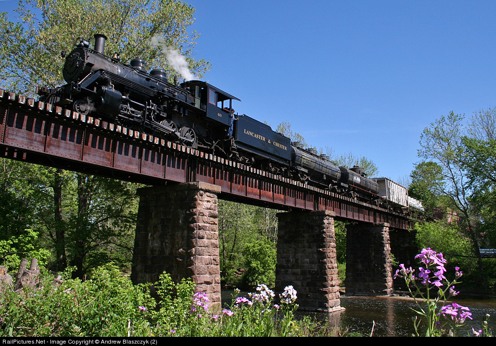| NHIR 40 in Lancaster & Chester livery crosses the infamous Rushland Trestle during a railroad organized photo charter. This was the first trip I had my brand new Rebel XT and three years and 125,000 photos later she's still going strong despite numerous lens replacements and upgrades. |