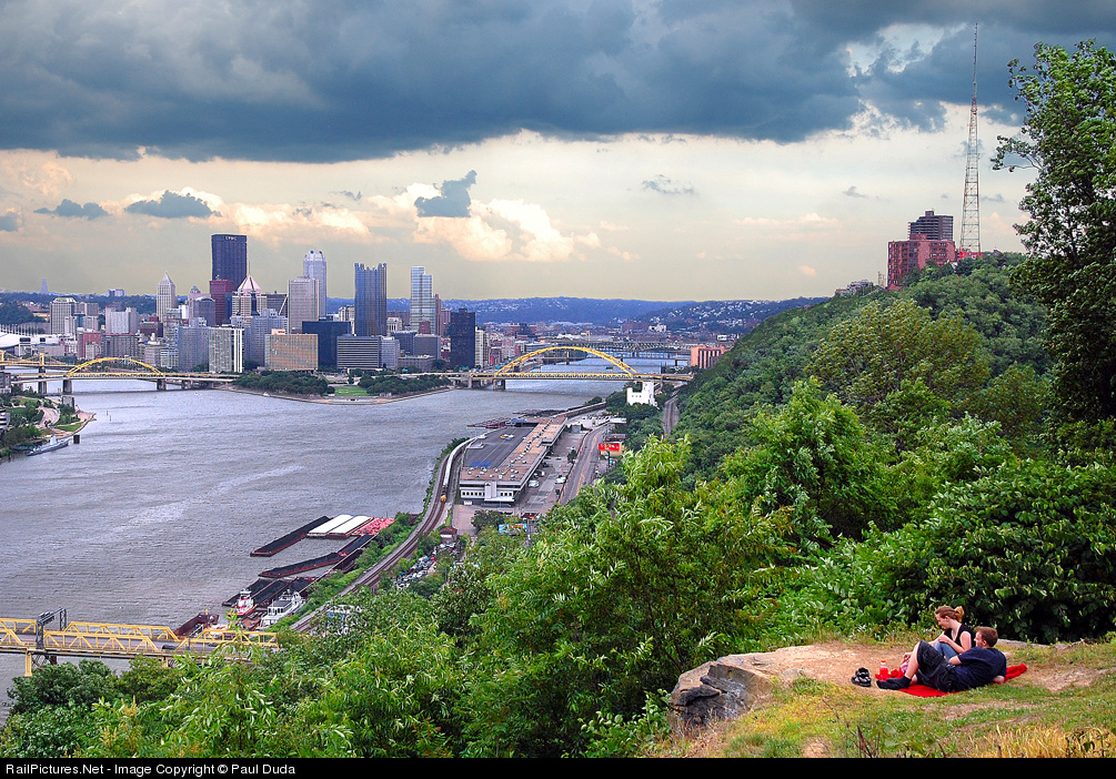 As a summer storm forms over downtown, a couple takes in the view from atop Mt. Washington as Q217 runs along the Ohio River.