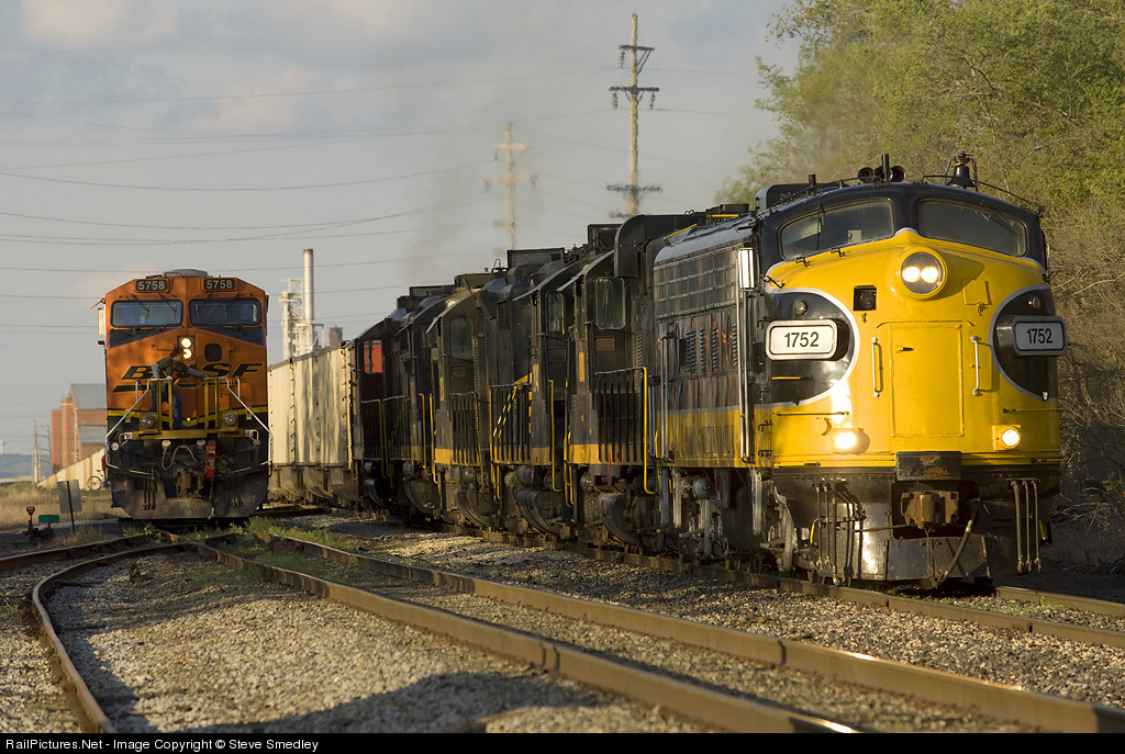 Peoria & Western Railway engineer Dave Henry begins to work his power of FP9A, GP8 and four GP20R's on a 135 car loaded coal train recieved from BNSF at Darst Street on the south side of Peoria Saturday May 8, 2009. Conductor Josh Flatley is exchanging paperwork with the conductor aboard the BNSF DPU unit at left.