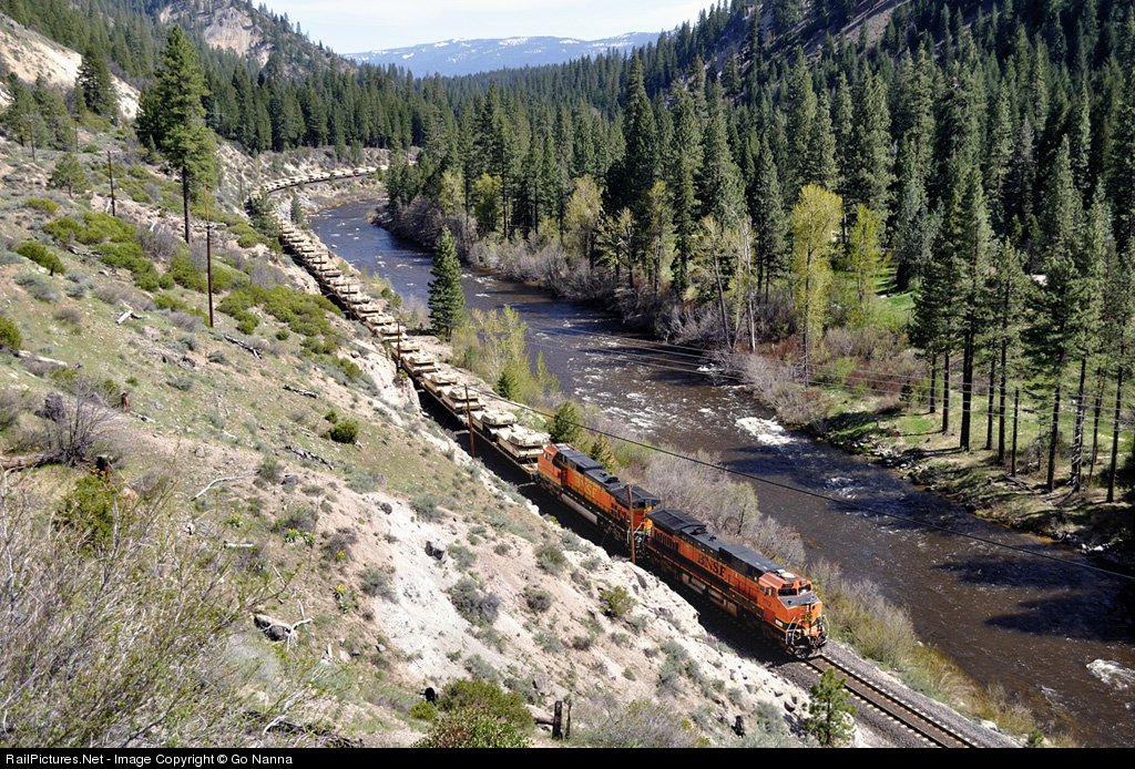 | BNSF military movement special comes to the FRC. I encoutered this military special at Clio trestle and followed it down to Belden via Keddie Wye. It is a nice sunny day with a refreshing breeze blowing down through the canyon. |