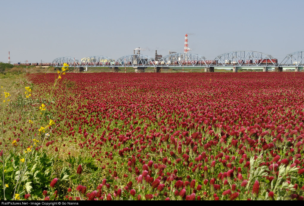 | Shores of the Abukuma river are covered with Strawberry candles in blossom. The red flowers are seen only in this period of the year, which is in good combination with the pretty red loco. |