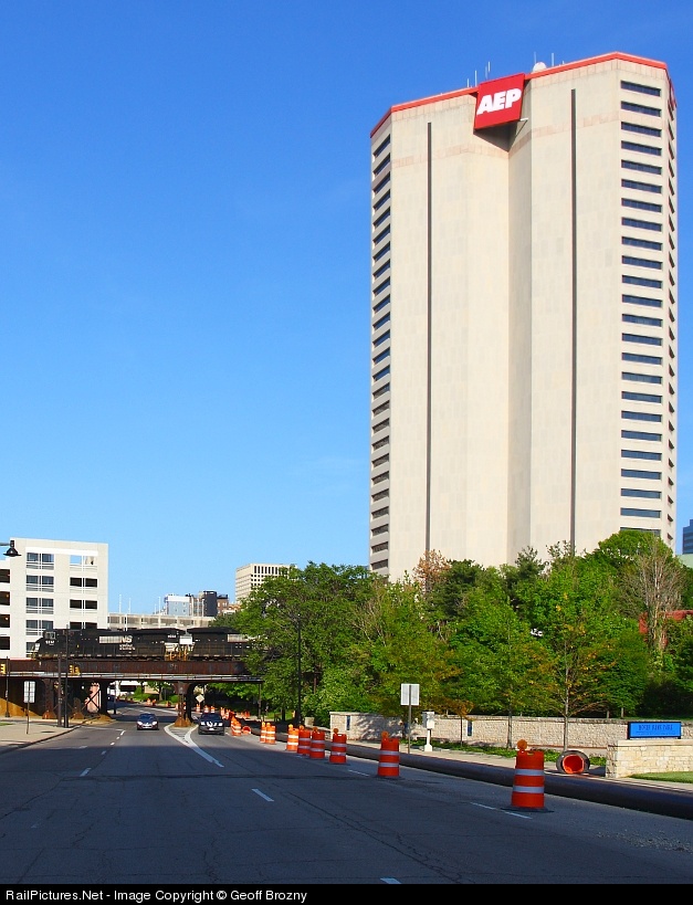 Dwarfed by the AEP building, NS 116 passes over Spring St on its way though Columbus.