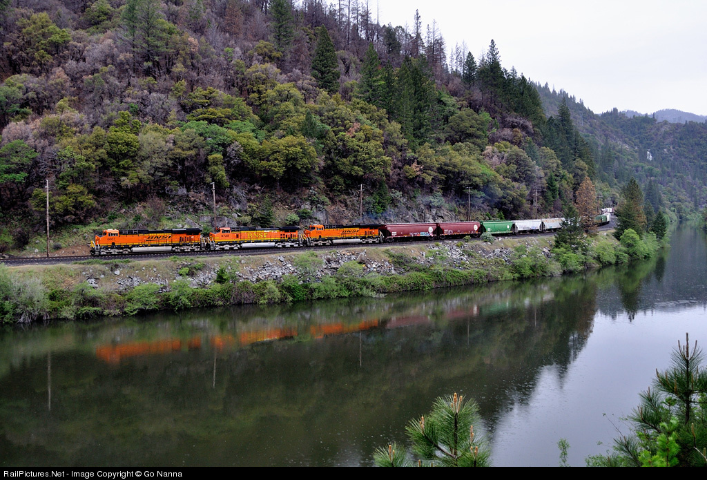 | It begins raining as this BNSF general freight approaches Pulga along the Feather River Canyon. Train stopped here for 30 minutes with their orange bodies beautifully reflected on the river surface. |