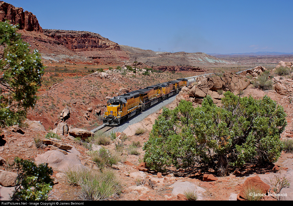 | Union Pacific's Friday only 'Potash Turn' rambles along the Cane Creek Subdivision just north of Seven Mile, Utah. The upper 30 miles of the 36 mile route have been upgraded to allow a 49 mph track speed for the haulage of uranium tailings from Emkay to Brendel. |