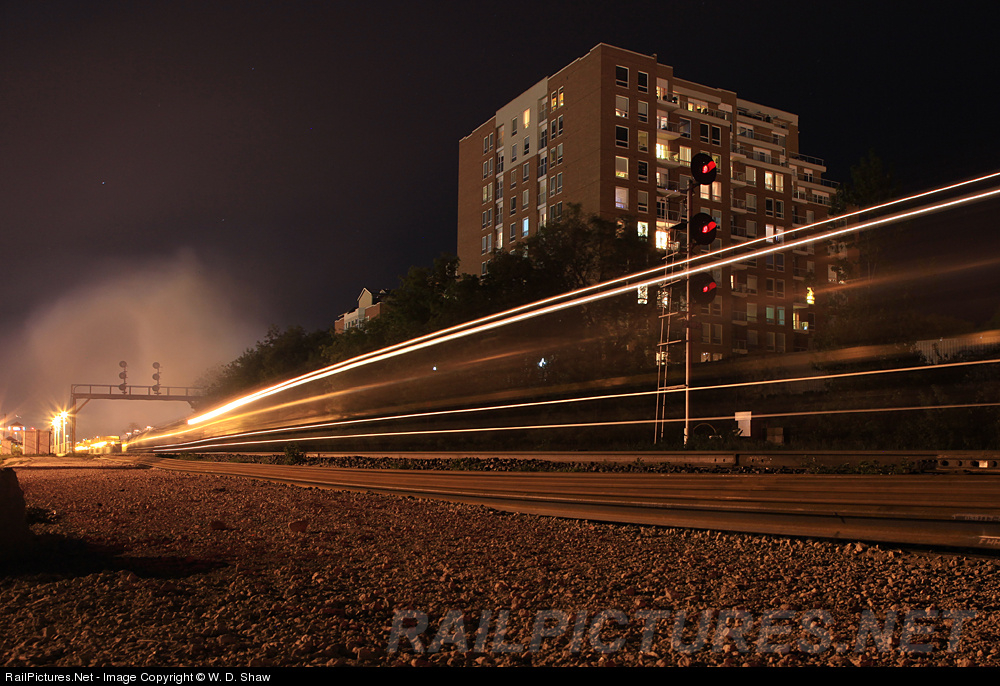 | Workin' on the night moves... Getting the clear to leave the passing track at Oakville Station and go on to Main #2 CN 557's lead unit belches a skyful of blue oil smoke as she accelerates westward to Bronte and/or Aldershot. |