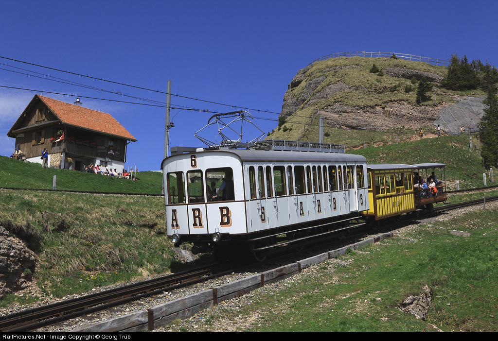 This is worldwide the oldest electric cogwheel rail car, built in 1911 for the Arth-Rigi-Bahn (ARB). He comes slowly down from Rigi Kulm with car B 35 from 1899 and C 11 "Bambus" from 1889 (rebuilt 2000).