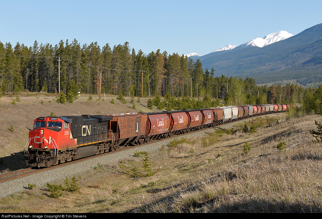 | CN G888 has just left the Tete Jaune sub at Harvey and is now proceeding timetable west (south) on the north connecting track towards the Robson Sub at McCabe and will continue to Lubin where it will swing onto the south connecting track and head east up the Albreda Sub towards Jasper. This route is necessary for most eastbounds to ensure they make it up the hill. The Albreda Sub is much less steep than the Robson Sub. |
