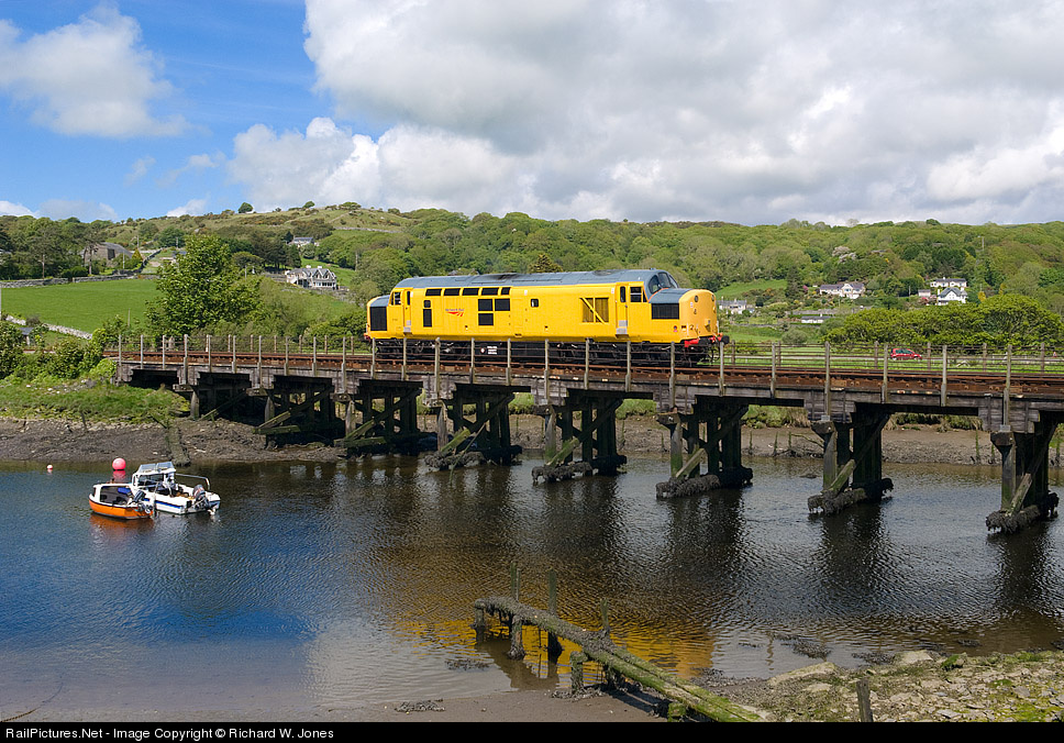 | 97301 creaks over the trestle bridge over the River Artro at Pensarn on the return 0Z97 14.29 Pwllheli to Shrewsbury Coleham route learning train, the first time that a Class 97/3 has run up the coast. |