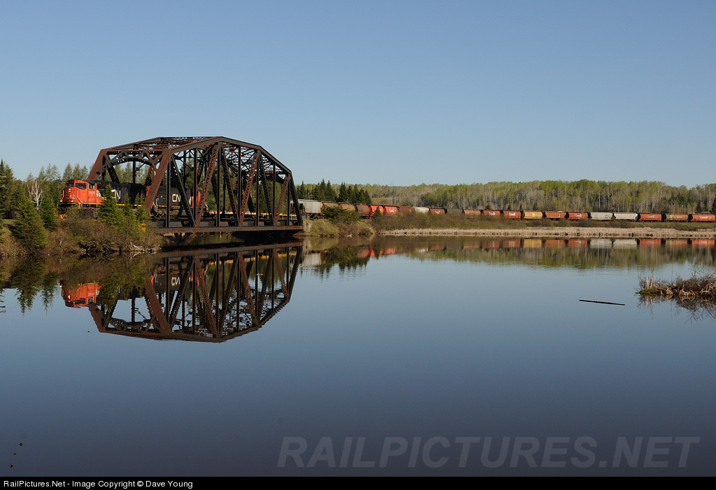 Rolling over glass. CN 436 gets a near perfect reflection in the Kaministiquia River.