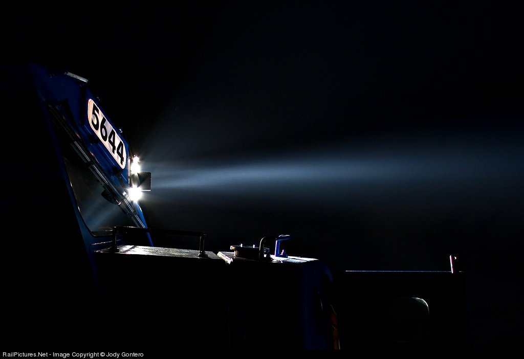 Conrail 5644's headlight lights the night sky as she poses in the dark.