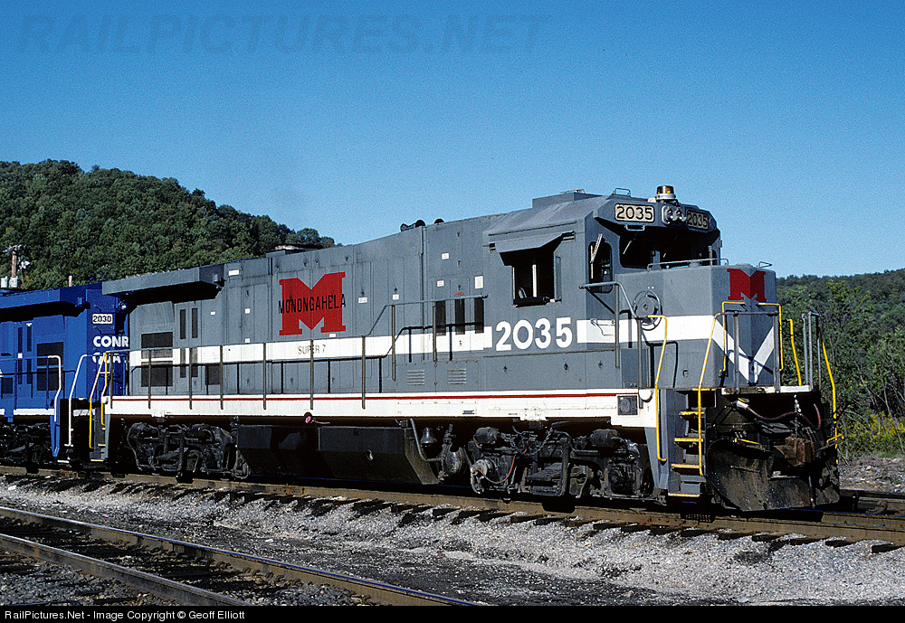 An un-Conrailed Monongahela Super7-23B, number 2035, waits in the yard at West Brownville, PA to depart with an empty train of hoppers for the coal mines of southern Pennsylvania.