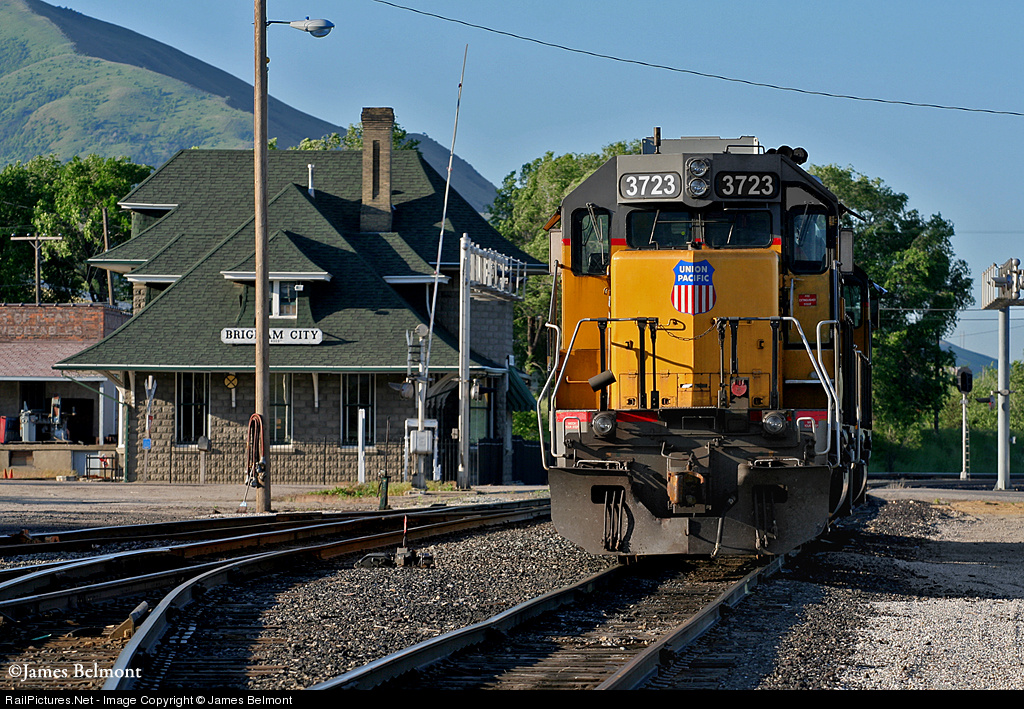The sun has risen over the Wellsville Mountains and another day has begun at Union Pacific's terminal at Brigham City, Utah. UP 3723, a vintage EMD SD40-2 built for the UP in February 1980, will power the LCG46 local from Brigham City to Ogden and return. The beautiful cut stone depot was built for the Oregon Short Line Railroad (a UP subsidiary) back in 1906 and serves as the Golden Spike museum, owned by Box Elder County.