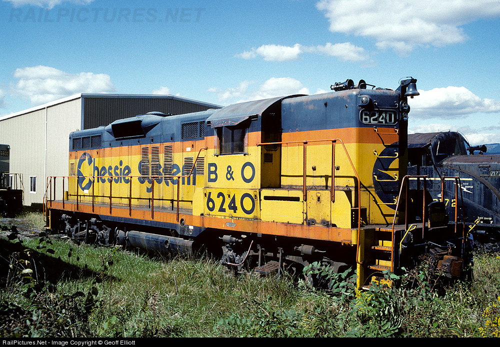 B&O (Chessie) 6240 sits out behind the South Branch Valley shops next to WM BL2 7172. The next time I woudl see this unit would be in 2007, 14 years later, but now 6240 wears a fresh coat of Chessie paint and works hard to pulling freight for the SBVR.