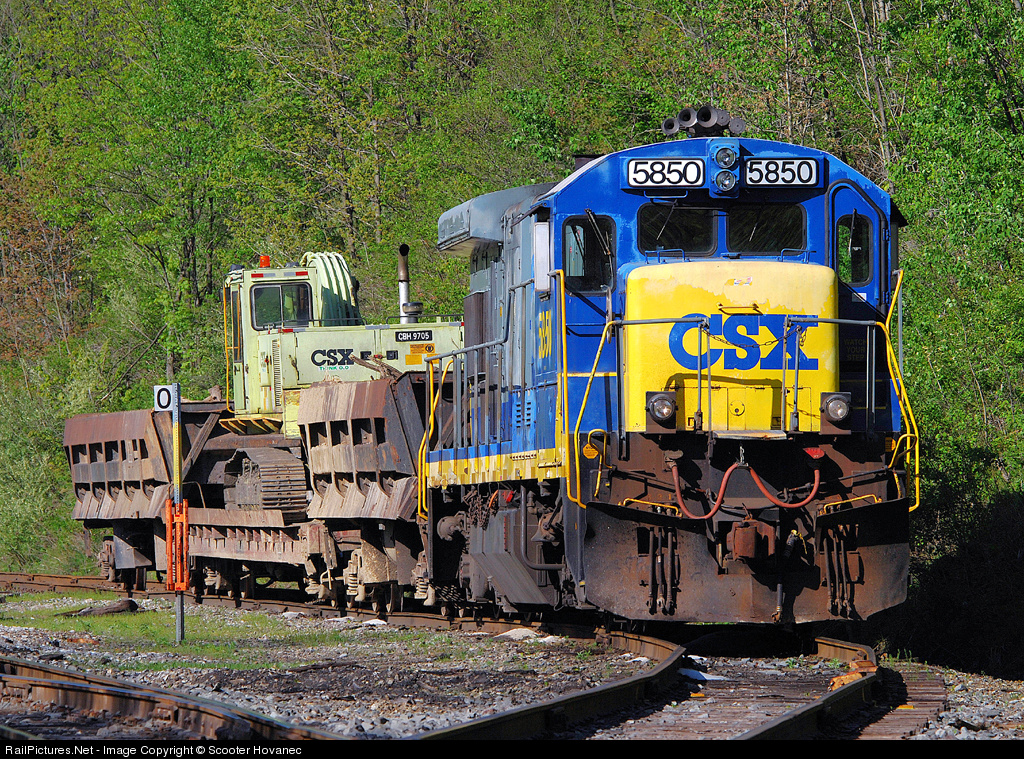 Milepost Zero. This is the bottom end of the S&C Sub, and today work train D059 is parked on one of the sidings in Rockwood. In the not too distant past the B36-7 which is now relegated to ditching duty, used to haul the priority pig trains over the Keystone Sub, just behind the photographer. CSXT 5850, nee SBD 5850, Built 5/85, Builder Number 44853, Batch Number 1405-36.