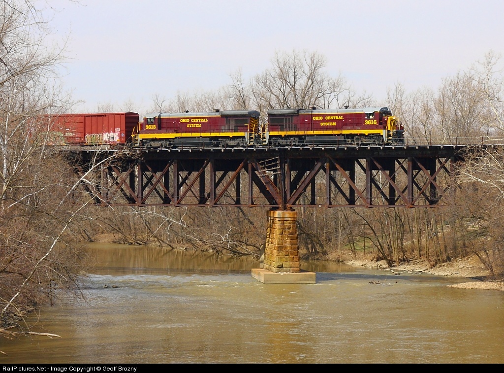 | OHCR 3616 and 3616 pull CBT-17 east on the Buckeye line over the Scioto River, heading back to Newark from there interchange with NS in the now closed Buckeye Yard. |