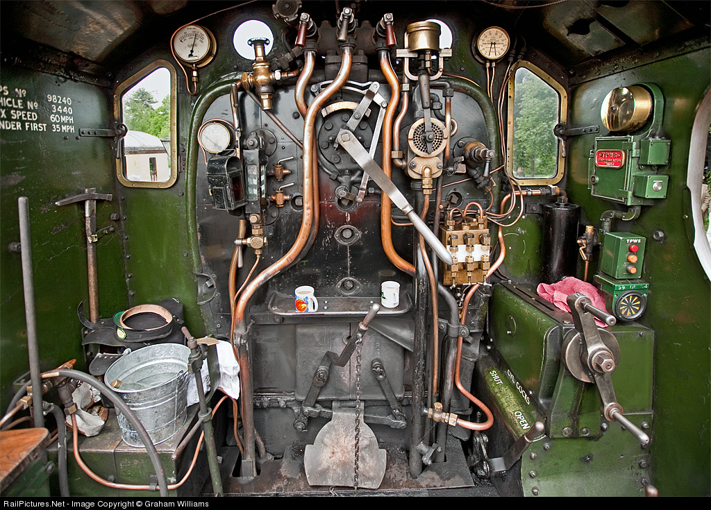 The cab of GWR no. 3440 City of Truro> This loco was apparently the first to reach 100mph in 1904. Just imagine going at that speed on that small footplate. I don't think the tea mugs are original 1904 vintage though.