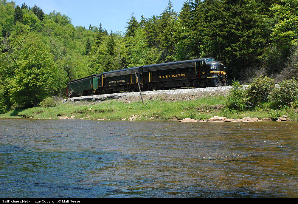 Western Maryland Revival! With two F units painted in the Western Maryland Railway's speed lettering and former WM passenger coach #835 in tow, the D&GVR's Cheat Mountain Salamander passenger train is southbound for Cheat Bridge, WV, out of Elkins, WV, with a train full of tourists. The route of the CMS follows the isolated Shavers Fork of the Cheat River in the Monongahela National Forest.