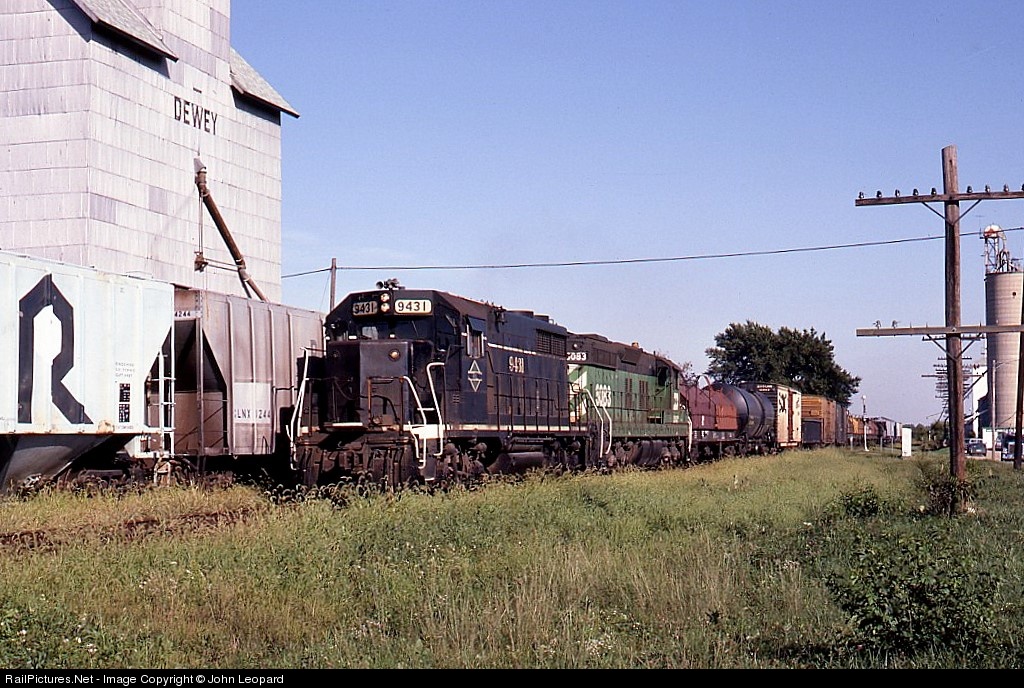 | Westbound train No. 2 passes the elevators at Mineral behind a rare former IC GP28, only 26 were built by EMD. |