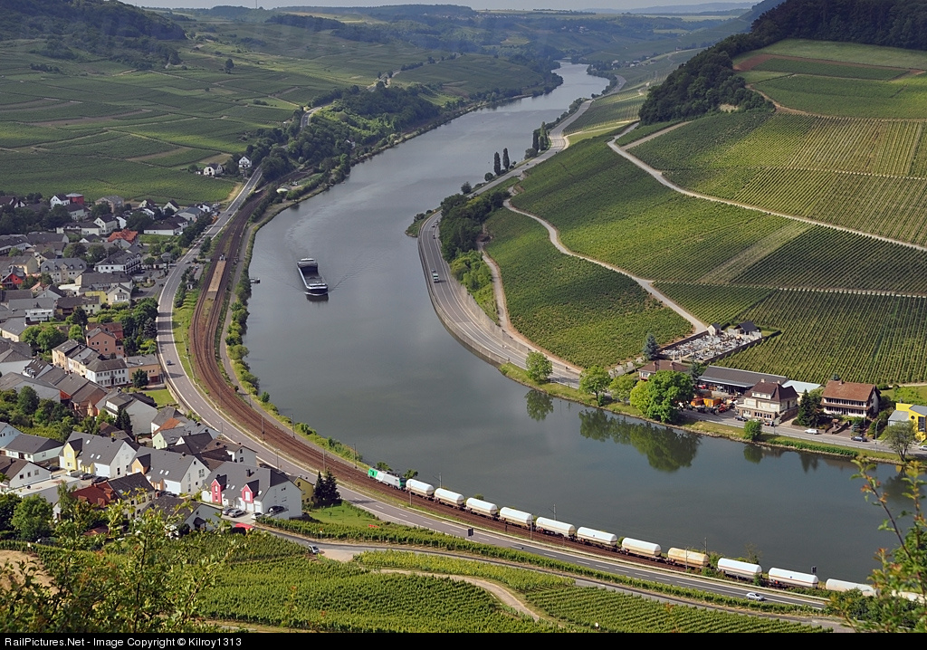 | A unit freight train proceeds towards the French border while an empty freight ship goes downstream on the Mosel river. The middle of the river marks the border line between Germany (left) and Luxembourg (edge of Machtum village at the right). |