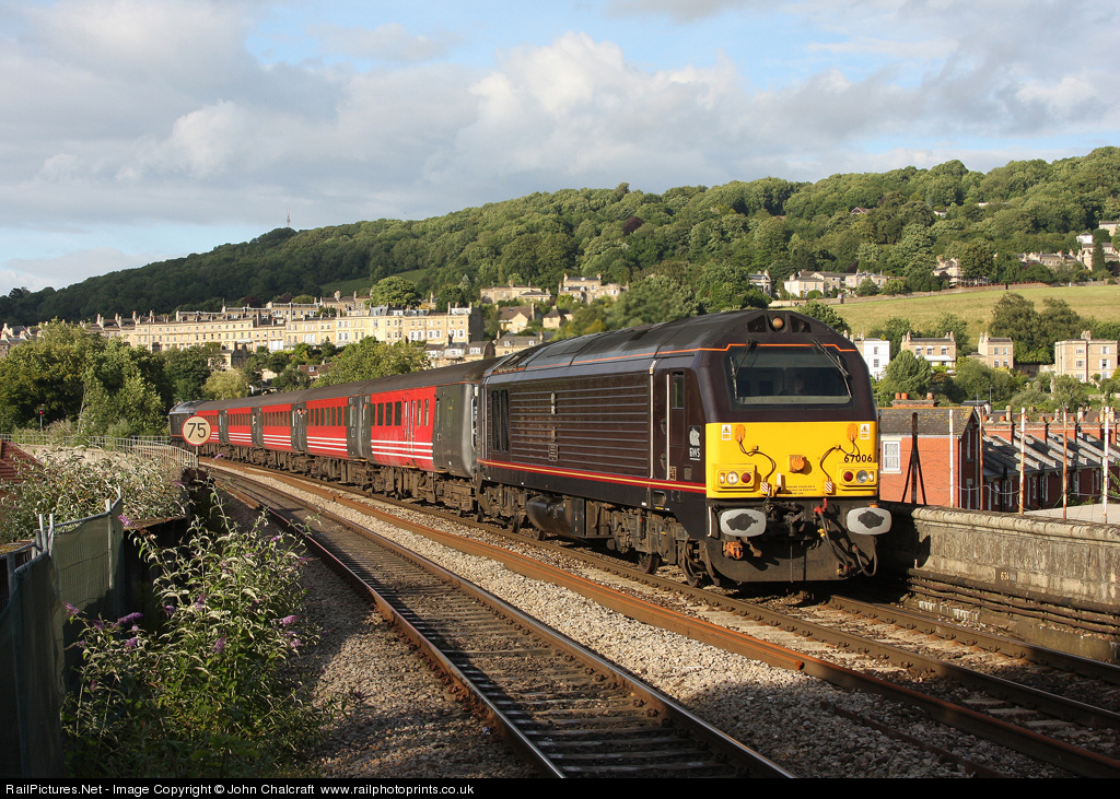 | The 17.20 Weymouth - Bristol FGW service enters Bath Spa top 'n tailed by the 2 Royal liveried Class 67's, 67006 at the head, 67005 at the rear. These 2 locos are specially painted in a livery that matches the Royal train. |