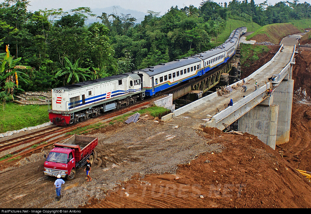 | CC20134 leads Fajar Utama YK Express,passing Karangsari Bridge where the double track project (between Purwokerto-Patuguran) is working. The routes of this trainset is PasarSenen Station (Jakarta) to Tugu Station (Yogyakarta). |