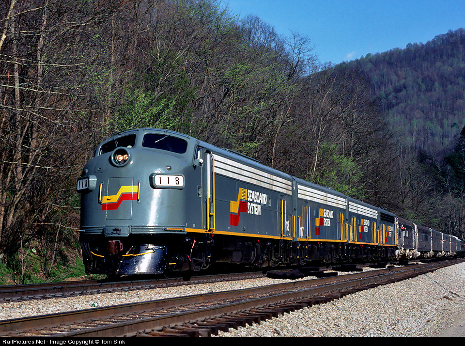 Two months before being merged into CSX the Seaboard F units lead a nouthbound passenger train at Green Mountain, NC on the present-day CSX Blue Ridge Subdivision