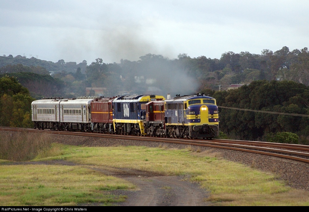 4403 and 4807 tow SETS (Sydney Electric Train Society) electric locomotives 8606 and 4615, as well as 'U boat' interurban power cars 5021 and 5003, south through Menangle en route to Junee for storage. This train was operated by the Australian Railway Historical Society (ARHS) ACT division, and was part of a transfer to remove the SETS vehicles from Hornsby Car Sheds in the northern suburbs of Sydney.