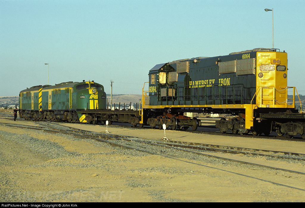 | All taped and packaged ready for delivery. Newly-built Hamersley Iron 6064 towers over GM11 and its AN mate while on special transfer bogies at Dry Creek yard. The last loco of the order is awaiting delivery to the Pilbara via the Nullabor and Perth. Built at Clyde-GM in Rosewater, all the 60 class units were transferred on broad gauge bogies to Islington then using road cranes transferred onto standard gauge bogies for the trip west. |