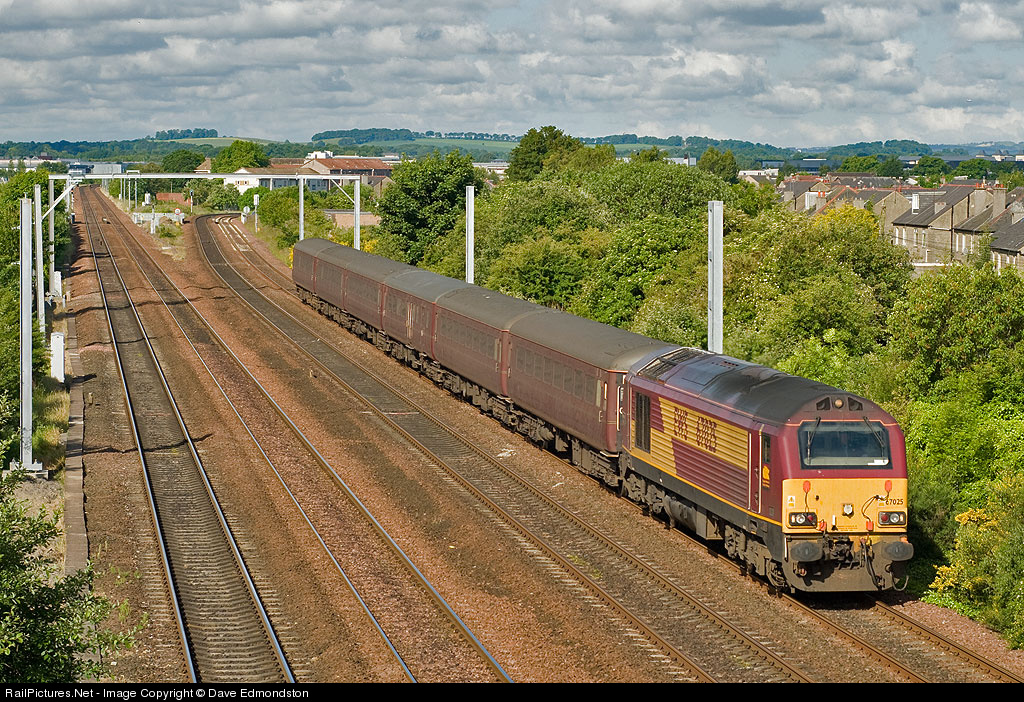 | The return of the morning loco-hauled 'Fife Circle' service to Edinburgh. These must be the grubbiest, drabbest coaches in the western world(!). This is another scene which will shortly change with the impending electrification project between Edinburgh and Glasgow. |