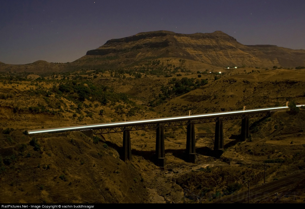 A light trail of Howrah bound express train from Bombay VT passes over a viaduct on Thull Ghats near Igatpuri town in Maharashtra state of India.
