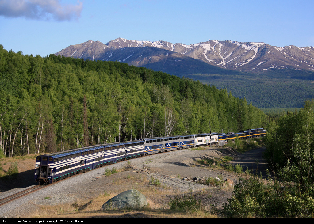 Two SD70MACs up front wheel the southbound Denali Star at nearly 60 MPH through the wilds of Ft. Richardson Army Base as they approach the home signal at the north end of Reves siding, MP 129.2 and only 15 miles out of Anchorage. The passengers' 12 hr and 356 mile journey from Fairbanks may be nearly over, but the scenery surely hasn't let up. The Chugach Mountains provide a spectacular backdrop regardless of whether you're riding in an ARR, Royal Celebrity Tours, Holland America, or Princess Tours coach.