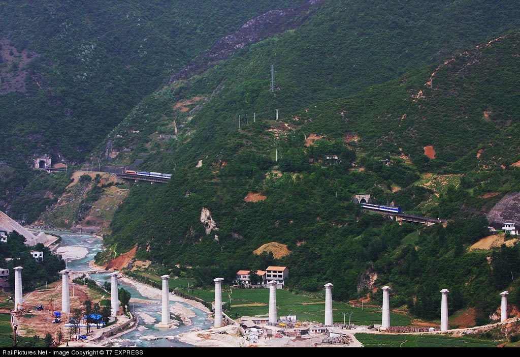 The northbound express train No. T10 is crossing tunnels. A newly built railway is still under construction.