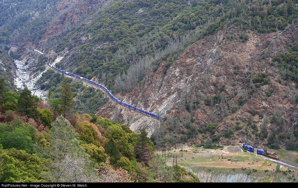 A 1x1 powerset on a stacktrain rolls East through Tunnels 9, 10, and 11 as seen from high above the Feather River.