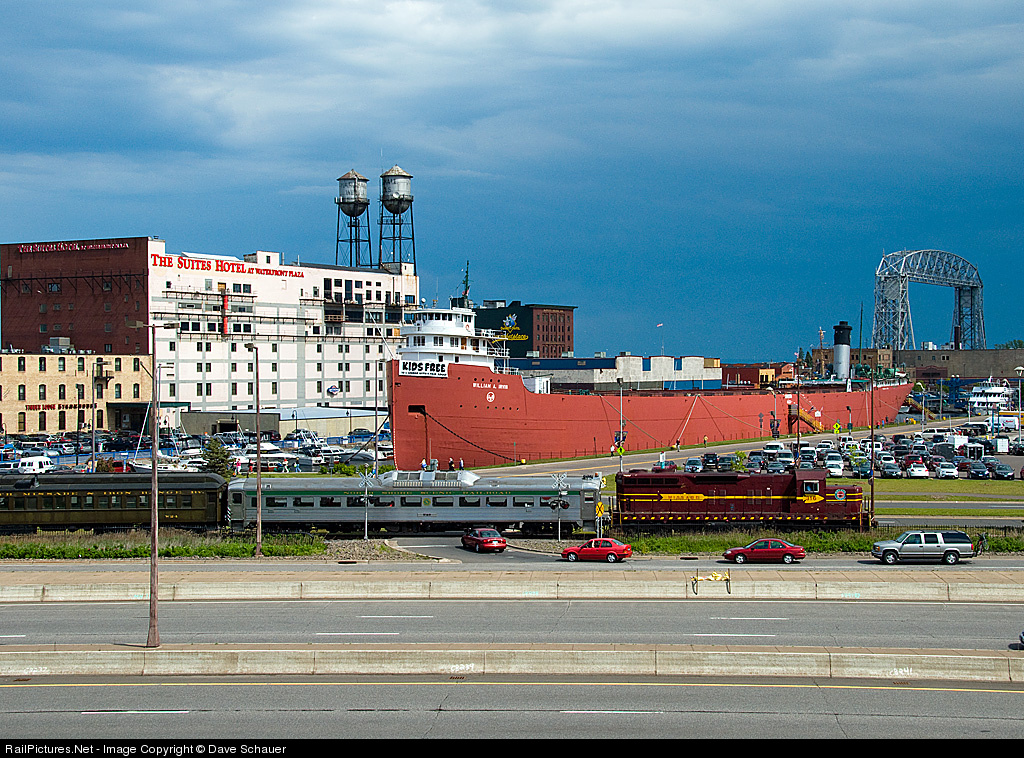 Former Missabe SD-M (SD18) 316 leads the Saturday Two Harbors Turn as it nears the end of its trip in downtown Duluth. At one time the 316 and ore carrier behind it were both owned by U.S. Steel.