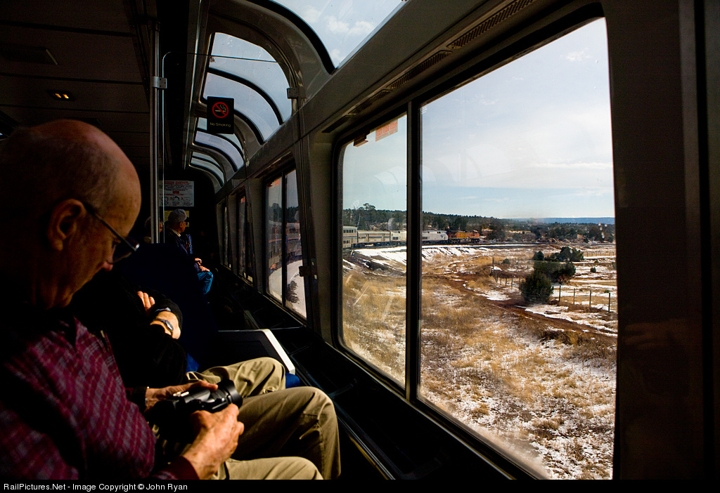 Passengers in the lounger car on Amtrak's westbound Southwest Chief are taking in the scenery as the train traverses a series of reverse curves. The train has help in the form of a BNSF locomotive due to unseasonably bad weather in northern New Mexico.