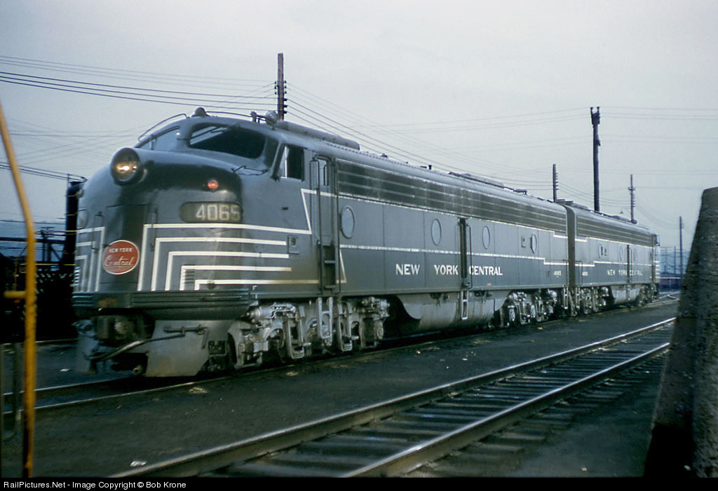 | E8 units 4065 & 4060 sit at Harmon awaiting duty on a westbound passenger train. The lead unit wears the short-lived script emblem that was used briefly before the simplified color scheme was introduced. |