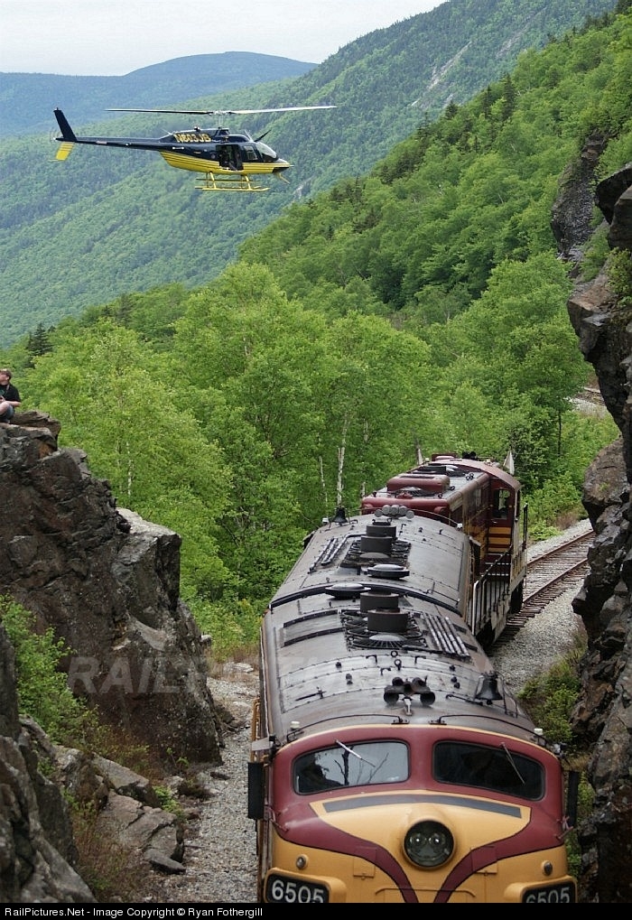 | The transformer move over Conway Scenic is pictured stopped while shifting the load to fit through The Gateway and head down through The Notch. The three units are shown sitting in the cut with the helicopter filming the move hovering above. The Schnabel car had approximately 30,000 lbs on each of its twenty axles. |