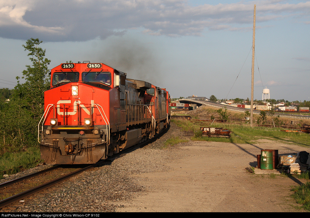 CN Q111 curves around Long Lake, under Highway 11, across the Kenogami River, and past the junction with the now abandoned Kinghorn Sub. With the oversiding trains, today's Q111 consists off: CN 2650, 2423, 8871, BCOL 4624 pulling 174 platforms; thats well over 12000ft of containers!