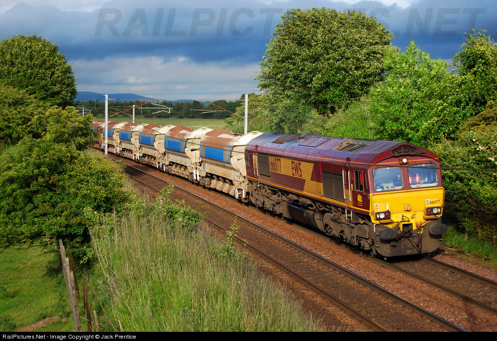 | DB (Ex-EWS) 66077 heads a ballest train northbound past Ravenatruther bound for Dalrymple Jn (Over in Ayrshire, West Coast Of Scotland) |