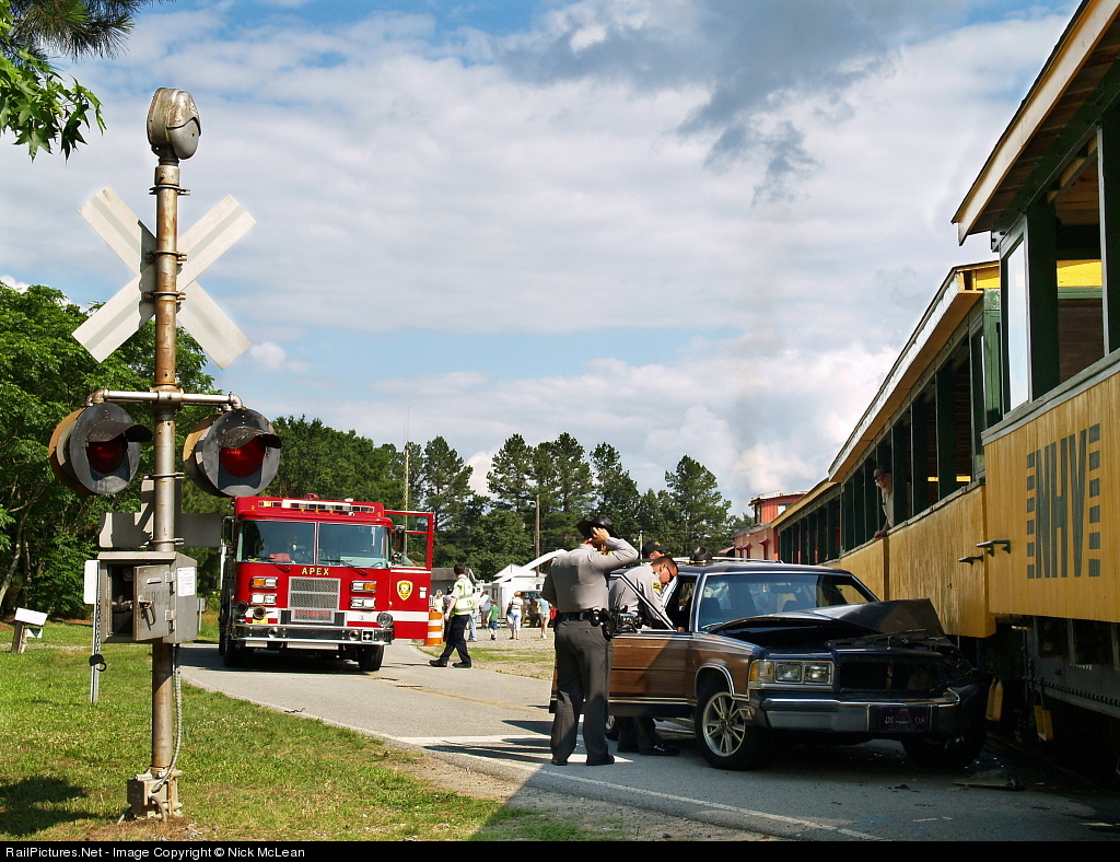 For those of you who have heard about this incident and have been wondering, the following is an official statement from the railroad: "An automobile/train collision occurred on the New Hope Valley Railway shortly before 4:00PM on Sunday, June 7th at the Daisey St. grade crossing in Bonsal, NC. Steam Locomotive 17 was in charge of the train. The Apex Fire Department responded within four minutes, followed by Apex EMS, the North Carolina Highway Patrol and the Wake County Sheriff’s Department. No one was injured in the incident. All passengers detrained in an orderly manner and were interviewed by Apex EMS and the North Carolina Highway Patrol. The driver of the car was also interviewed by Apex EMS and the North Carolina Highway Patrol. He was released on scene shortly after the incident. The New Hope Valley Railway wishes to ask the railroad preservation and rail fan communities to respect the privacy of all involved in the incident. The New Hope Valley Railway has no knowledge of and will not speculate on the driver of the car or his condition other than what has been released in this statement and what has already been reported in the media. The North Carolina Highway Patrol’s investigation is currently ongoing. Damage to railroad property was minimal. The New Hope Valley Railway maintains a strong relationship with law enforcement and first responders in the community. The railway hosted an emergency training ‘mass casualty’ drill in cooperation with local first responders and law enforcement in the fall of 2008. The drill not only prepared our railroad volunteers for how to react to an emergency situation but also familiarized first responders with our excursion train so they may better react to incidents such as this one."