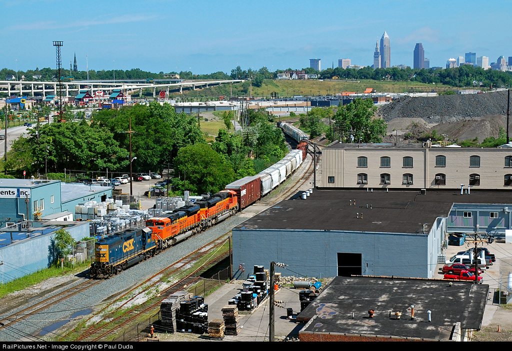 | D741 pulls out of Clark Ave. Yard in the Flats of Cleveland with 2 BNSF ACE's behind the usual power. As rare as it is for 6 axle power to make it up this line, it is even more strange to see foreign power up here. The ACE's came in on E885 2 days prior, to store the cars up at Clark Yard, another sign of the economy. |