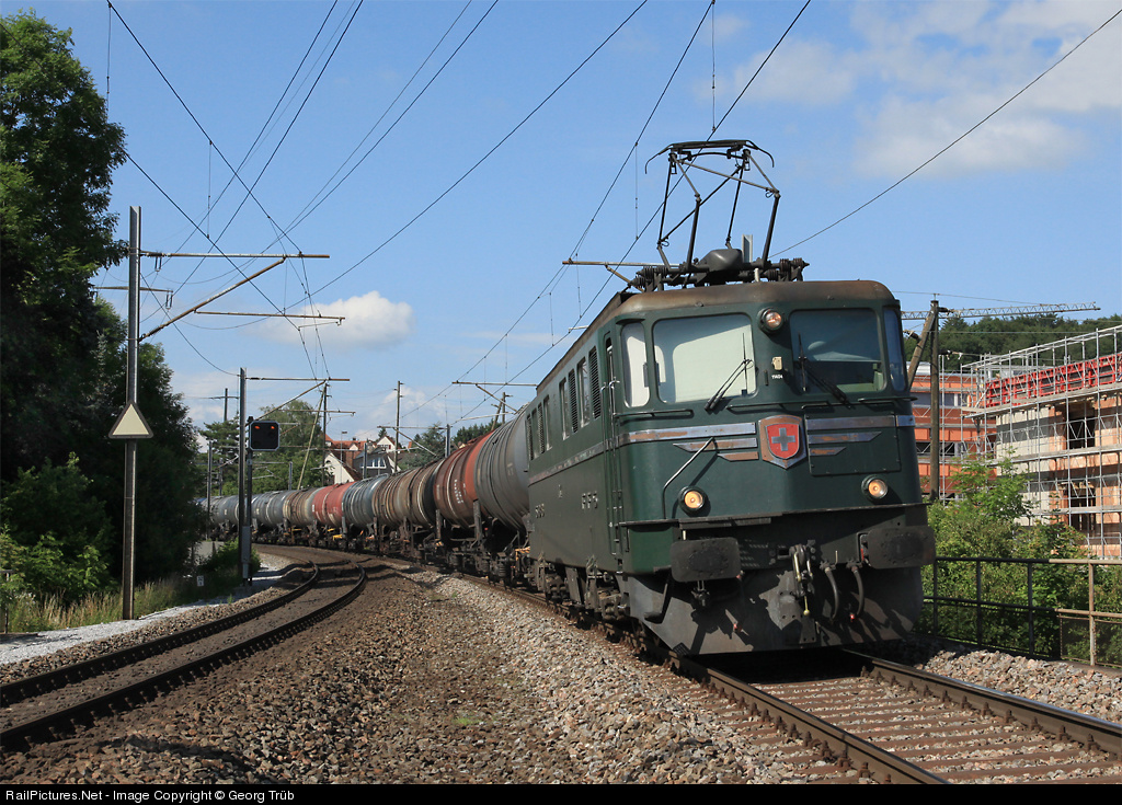 | The oldest operational of the Ae 6/6 locomotives (and one of only two of the chromium series in green), 11404 from the year 1955, with an empty tank car train from Islikon to Basel shunting yard is passing Wiesendangen. In the morning the engine brought the heavy (1580 ton) full train from Basel to Islikon. Ae 6/6 are very rare in such severe duty today. |