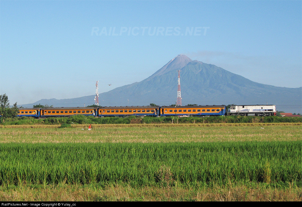 | KA-152 from Padalarang to Kediri passing district of Delanggu with mount Merapi as background, one of the world’s most active volcanoes. |