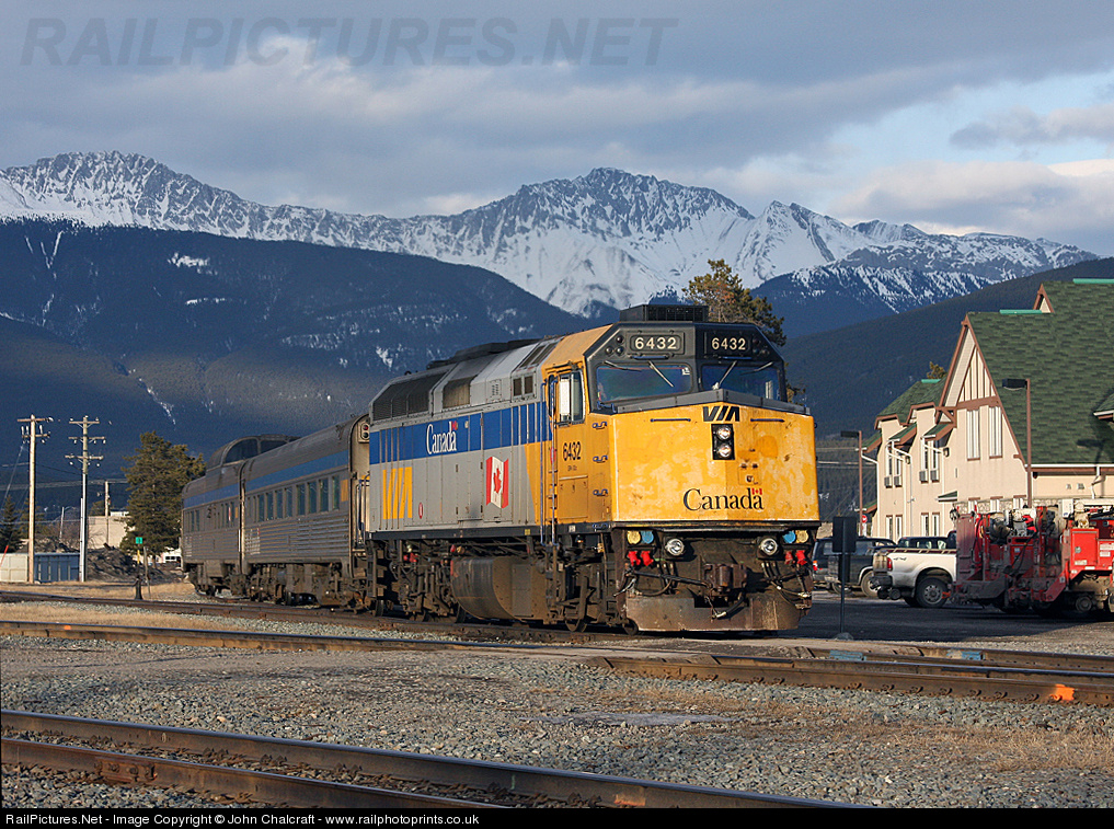 | Having just arrived from Prince George, the 2 cars and F40PH2 6432 that form the winter season 'Skeena' are turned on the 'Y' at Jasper, Alberta, 24/3/09. ©www.railphotoprints.co.uk - John Chalcraft |