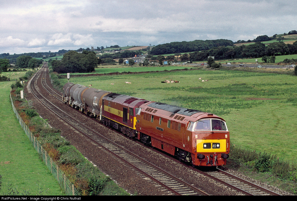 Piloting 60085 on the 6V70 Cliffe to St Blazey empty china clay tanks, preserved D1015, Western Champion approaches Tiverton Parkway station, between Taunton and Exeter, in August 2002. The Western was being transferred to Cornwall for crew training.