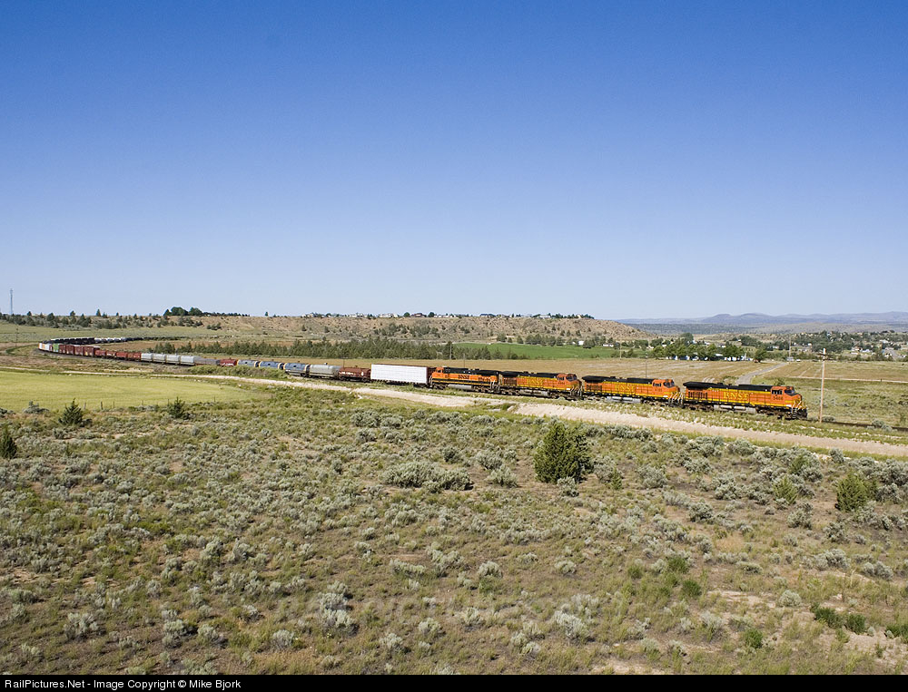 | BNSF's Oregon Trunk is one of the few places left where manifest trains are commonplace. 5 locomotives, 4 on the front and one on the rear, pull a train up onto the high desert in eastern Oregon. |