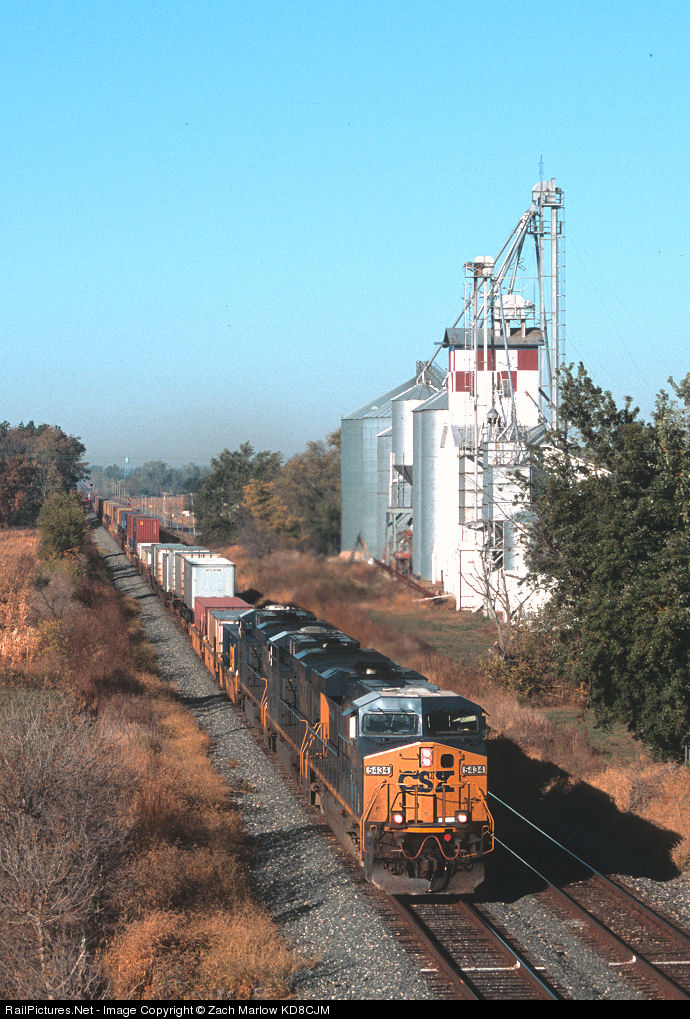 CSXT 5434 leads train Q108 by the grain elevator at Dawn,OH. PROVIA 100F